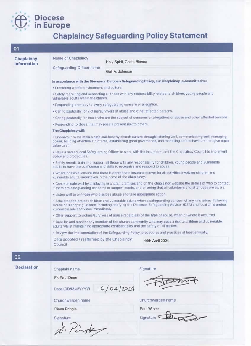 The Church of England requires that each centre of worship (in our respect, The Chaplaincy of the Holy Spirit, Costa Blanca North) has a suitably trained person, designated and approved by the Council of the Chaplaincy, to act as a Safeguarding Officer (the CSO), who will oversee safeguarding issues in concert with the lead chaplain